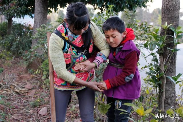 如果大病发生在自己身上,也许小金峰爸爸也不会如此绝望。眼看着儿子的病情越来越严重,小金峰的爸爸却没有一点办法。那几天,他到处找人借钱,可认识的亲戚朋友和他家一样都是穷苦人家,即使尽了最大努力,筹到的钱仍然是杯水车薪。小金峰爸爸吃不下饭睡不着觉,经常在院子里呆呆地坐到天亮。2014年,大年三十的前一天,他用了最决绝的方式和这个世界选择了告别。图为何国秀带着孙子去干活。