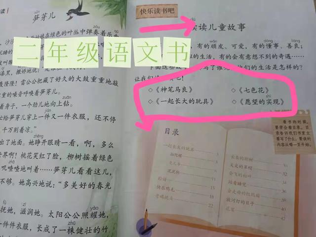 下面是我女儿二年级的语文书的语文园地,这里面就有“快乐读书吧”的书目,这些书紧贴着孩子的教学进度,也符合各年级年龄孩子的阅读能力。