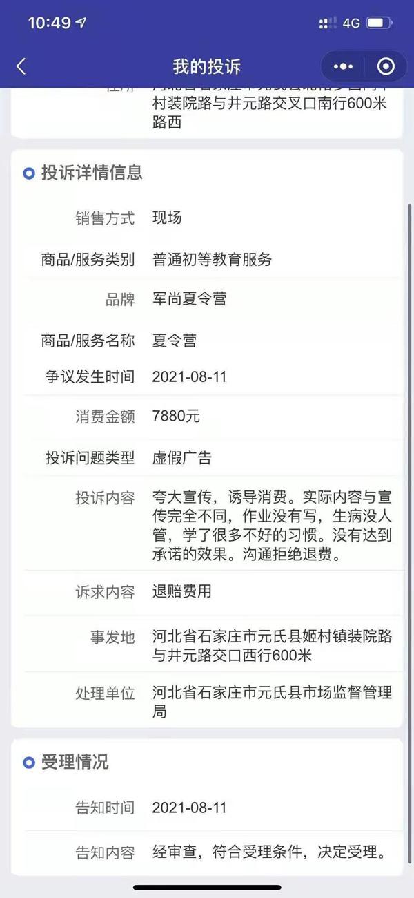 家长在国家12315平台上投诉军尚少年军校要求退赔费用